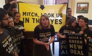 The following Monday, February 25th, over 200 young members of the Sunrise Movement joined about twenty Kentucky high school students outside the Capitol Hill office of Senate Majority Leader Mitch McConnell (R-KY) to demonstrate their support for the Green New Deal. They failed to meet him. Instead, the Capitol Police arrested more than forty of them.