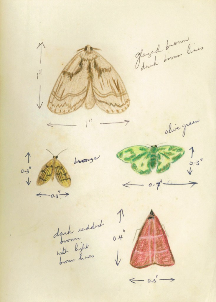 My only existing record of the year I spent at the Santa Cruz convent is an unlined school notebook with crayon drawings of the variety of moths that visited my room at nighttime. The setting would not be complete without them. Below are a few of my drawings of my nightly visitors.