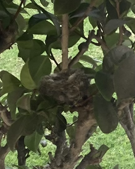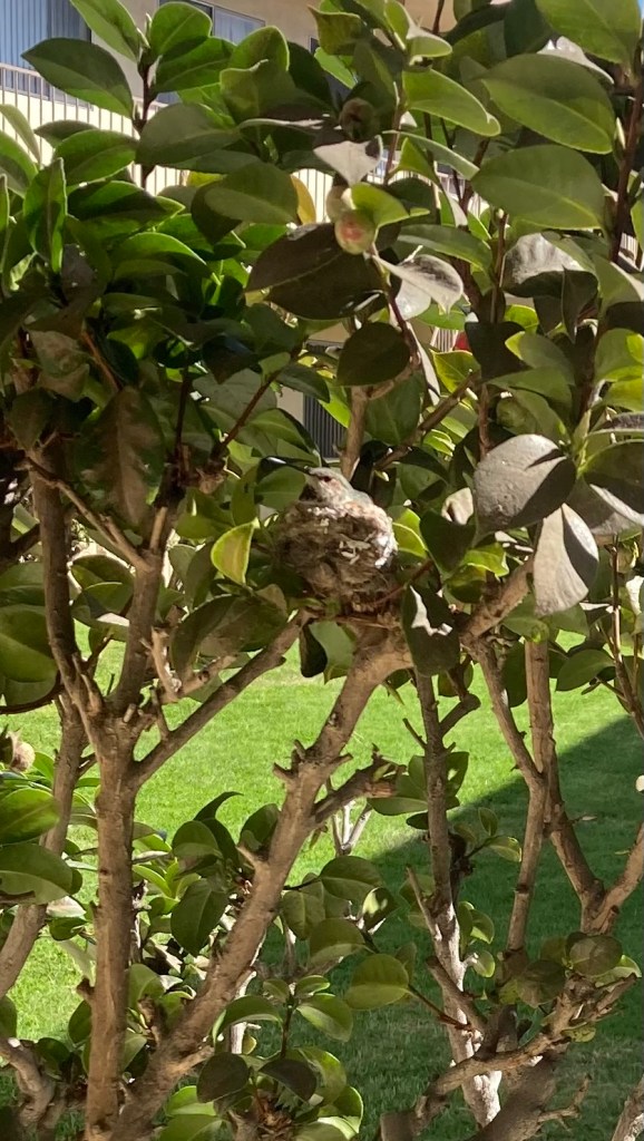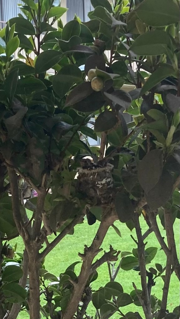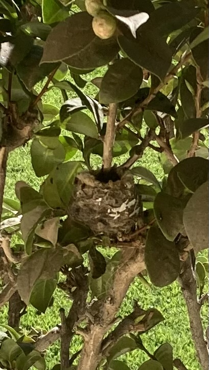 The greatest blessing this winter came from our two resident hummingbirds. The latest generation chose to build their nest in the camellia tree just about four feet outside my dining room window. This is the first time over the years. What an amazing gift!